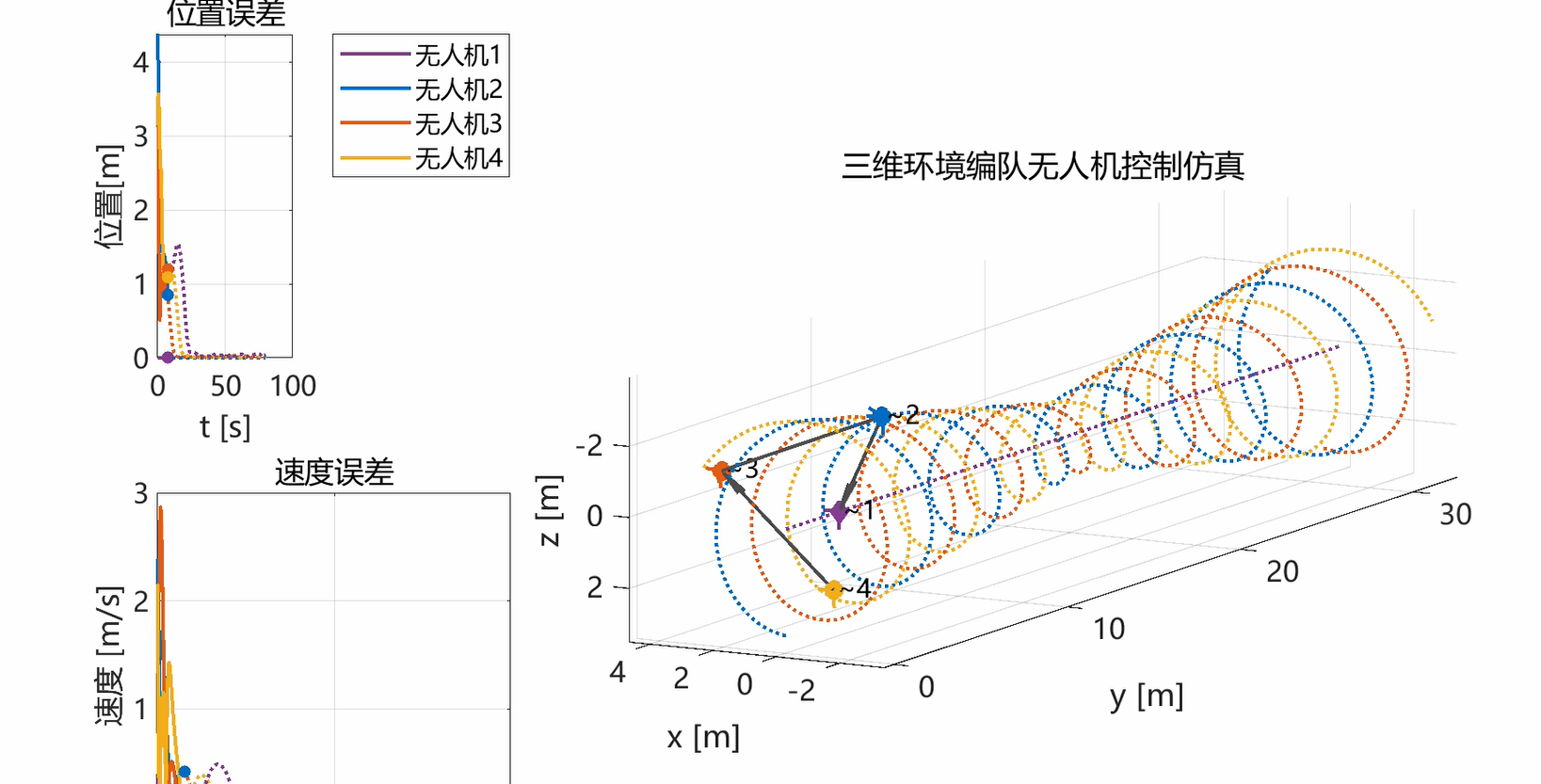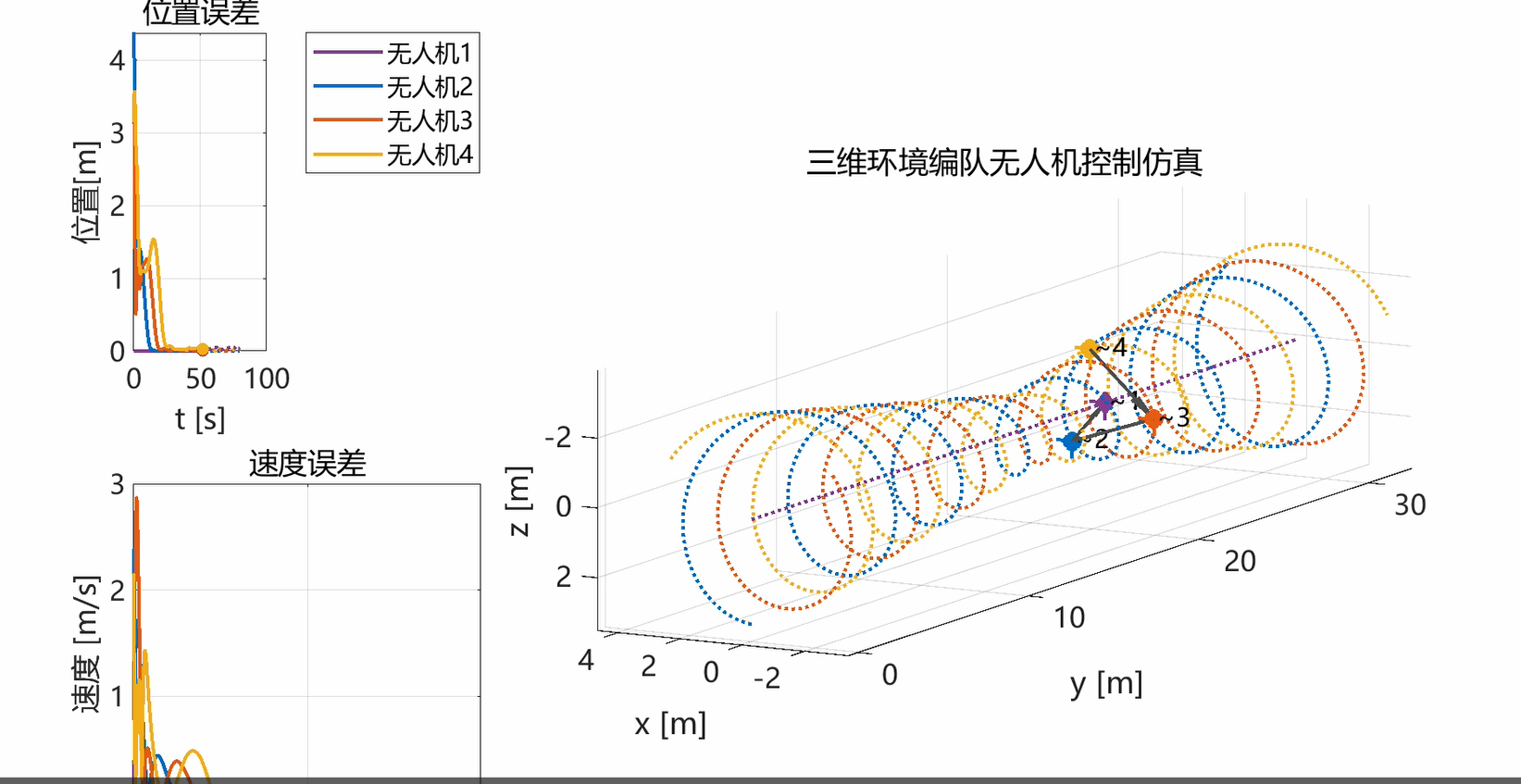 程序功能:生成期望轨迹、仿真状态演化、绘制三维轨迹与编队连线,输出位置/速度/指向误差曲线;可设通信拓扑、频率、速度、时长与增益;插值平滑轨迹,显示受限区域几何体与关键阶段标记,并支持视角设置。