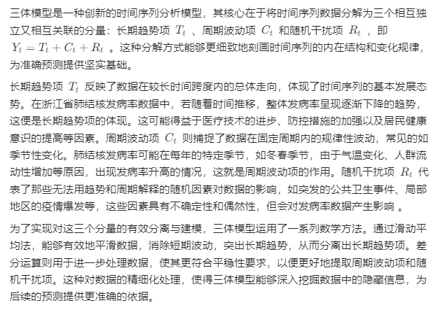相比之下,三体模型在处理这类复杂数据时展现出独特优势。三体模型通过构建趋势项、季节项、随机项的动态耦合体系,能够更全面、深入地捕捉时间序列数据中的非线性特征和动态变化规律。在经济管理领域,三体模型已成功应用于各种复杂数据的预测,如股票价格走势预测、市场需求预测等,能够有效应对数据中的不确定性和波动性,为决策提供可靠依据。其在公共卫生领域的应用,为肺结核发病率预测开辟了新路径,有望突破传统方法的局限,提高预测的准确性和可靠性。