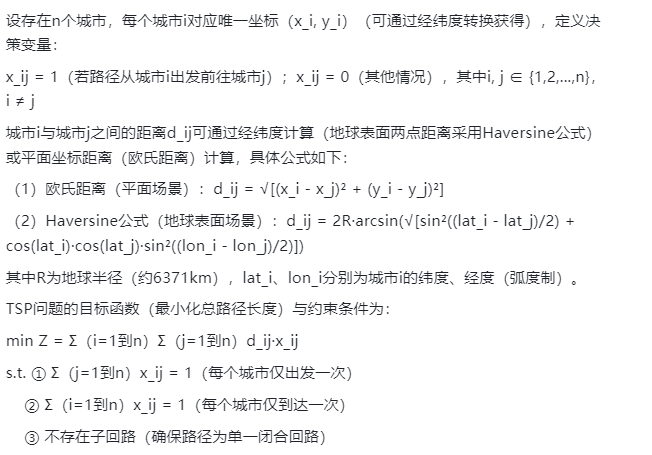 旅行商问题(Traveling Salesman Problem, TSP)是组合优化领域的经典NP难问题,其核心需求为:给定一组城市及城市间的距离,寻找一条经过所有城市且仅经过一次、最后返回出发城市的最短闭合路径。TSP问题在物流配送、路径规划、无人机巡航、电路布线等工程领域具有极强的实用价值——例如物流行业中,合理的TSP路径规划可大幅降低运输成本、提升配送效率;无人机巡航场景下,最优路径能减少能耗、延长作业时间。