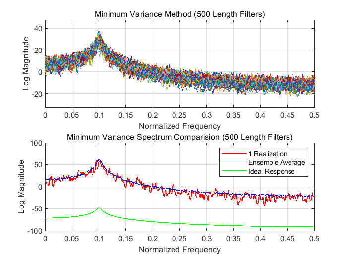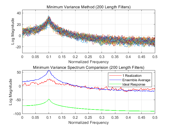 适配性分析:Capon法通过自相关矩阵的逆矩阵抑制了彩色噪声的相关性影响,相较于AR模型法具有更高的分辨率和抗噪声鲁棒性。但该方法对数据长度敏感(需足够多数据估计自相关矩阵),当数据量较少时,估计性能恶化,且计算复杂度较高(涉及矩阵求逆),适合数据量充足、强彩色噪声环境下的窄带信号频谱估计(如雷达信号处理)。