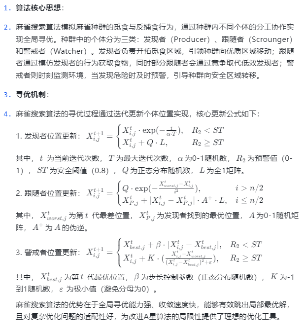 传统路径规划算法中,A星算法凭借启发式搜索机制实现了高效的路径查找,是栅格地图路径规划的经典方案。但其性能高度依赖启发函数设计,易陷入局部最优解,且在复杂密集障碍物场景下,路径冗余度高、规划效率下降。麻雀搜索算法(SSA)作为一种新型群智能优化算法,具有全局寻优能力强、收敛速度快的特点,擅长解决复杂空间的优化问题。