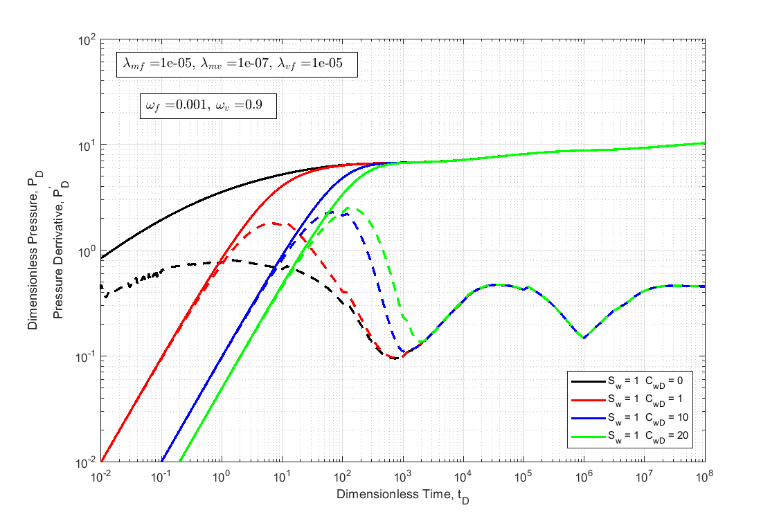 大型溶洞通常被视为一种独立介质,孔隙间流动方程被用于描述基质 - 裂缝 - 溶洞系统内的流动。本报告所研究的课题指出,大型溶洞内的压力以波的形式传播,同时满足质量守恒、动量守恒和能量守恒方程。随后,基于拉普拉斯变换和数值反演方法得到了所提出数学模型的解,并绘制了井筒压力及其导数的典型曲线,识别出六种流动状态 [3]。