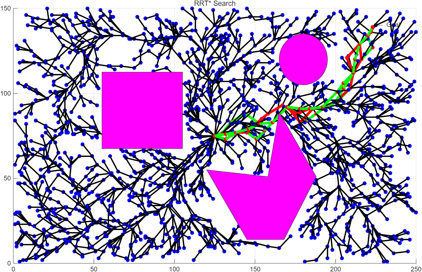 RRT*算法的核心优势是渐进最优性,能生成比RRT更短、更优的路径。但RRT*算法仍存在不足:一是在迭代初期,路径优化效果不明显,需要足够多的迭代次数才能逼近最优路径;二是搜索过程仍存在盲目性,尤其是在环境空间较大时,搜索效率较低;三是生成的路径平滑性仍有待提升。