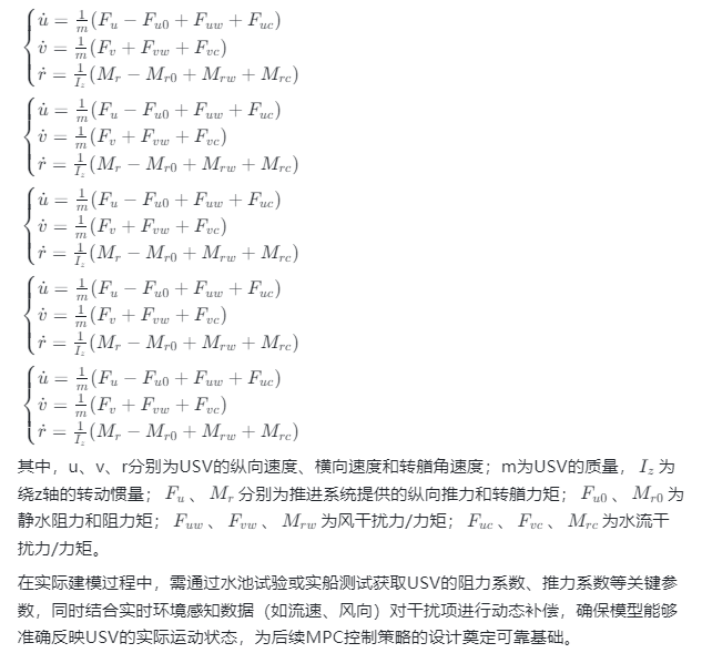 要实现基于MPC的USV精准控制,首先需构建能够准确描述其运动特性的动力学模型——这是MPC进行状态预测与控制优化的基础。USV的运动涉及水平面内的三个自由度:纵向(前后)运动、横向(左右)运动以及转向运动,其动力学特性受自身结构参数、推进系统性能以及外界环境(水流、风)的共同影响,呈现出强烈的非线性和耦合性。