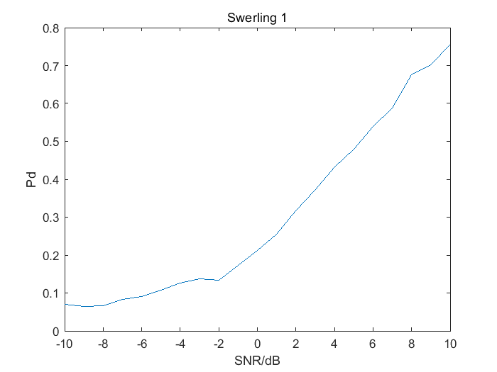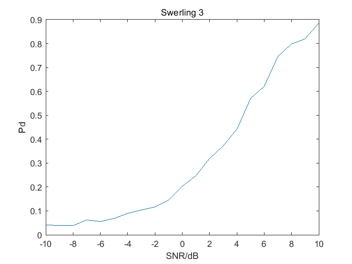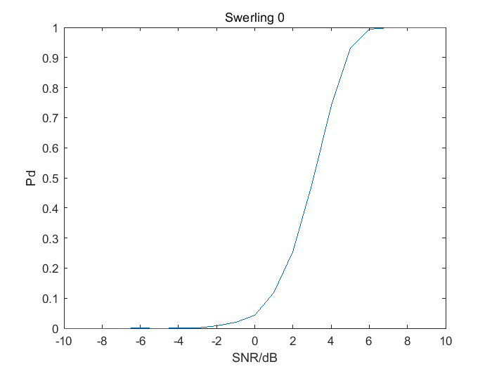 设雷达为平方律检波,检波后进行10个脉冲的非相参积累然后进行信号检测。要求产生Swerling0~IV型目标信号,设噪声为高斯白噪声,要求对信噪比SNR在[-10dB:1dB:10dB]变化范围内分别进行至少105次蒙特卡洛仿真,虚警概率为10-6。根据仿真结果画出检测性能曲线(横坐标为SNR,信噪比按照1dB为步长而变化,纵坐标为检测概率Pd)。