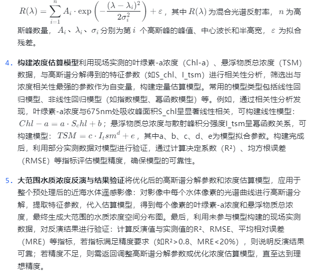 混合光谱提取与预处理根据现场采样点的经纬度坐标,在预处理后的遥感影像中,提取对应像素的遥感光谱曲线——这条曲线就是该采样点水体的混合光谱(包含叶绿素-a、悬浮物质、纯水等组分)。为了提升高斯谱分解的精度,还需对提取的混合光谱进行预处理:一是剔除异常值,排除因仪器噪声、云影残留等导致的异常光谱点;二是基线校正,消除光谱基线漂移的影响;三是归一化处理,将光谱曲线的幅值调整到统一范围(如[0,1]),便于后续高斯函数的拟合优化。