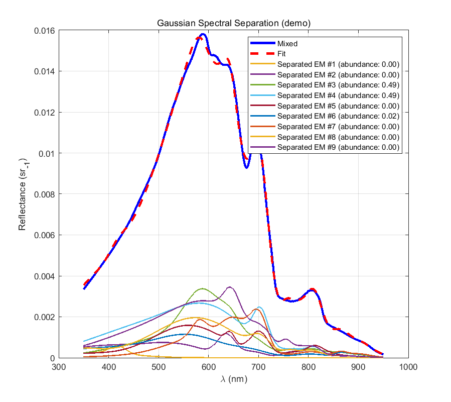 光谱分解技术是解决混合光谱问题的核心思路,其核心逻辑是将复杂的混合光谱拆解为多个单一组分的“纯净光谱”(端元光谱)的线性或非线性组合。而高斯谱分解,是利用高斯函数(正态分布函数)的平滑性、对称性和可调节性,对复杂光谱曲线进行拟合分解的方法——每个高斯峰对应一种物质的特征光谱峰,通过调整高斯函数的中心位置、峰值、半高宽等参数,使多个高斯峰的叠加曲线与原始混合光谱完美匹配,从而精准分离出各组分的光谱贡献。