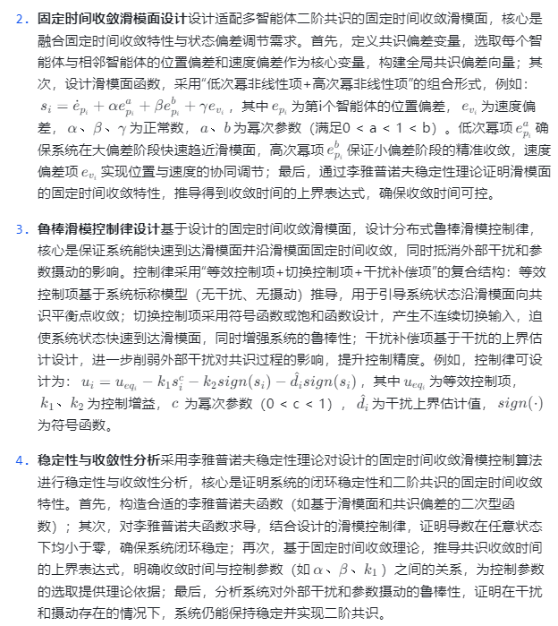3. 分布式一致性协议:适配多智能体的局部信息交互 结合滑模控制与固定时间收敛特性,构建分布式二阶共识协议,摒弃传统集中式控制对全局信息的依赖。各智能体仅通过与相邻智能体的局部信息交互(如获取相邻智能体的位置和速度信息),计算自身与相邻智能体的状态偏差,随后基于偏差信息和固定时间滑模控制律生成控制输入。这种分布式架构不仅降低了对通信带宽的要求,还提升了系统的容错性——即使部分智能体出现通信暂时中断或故障,其余智能体仍可通过局部交互维持共识过程,避免系统整体崩溃。