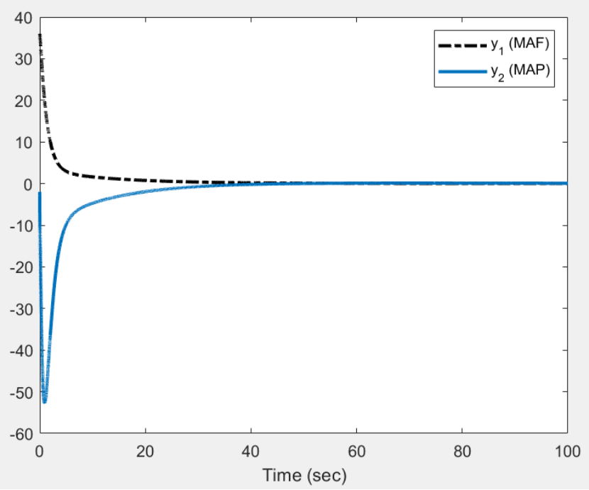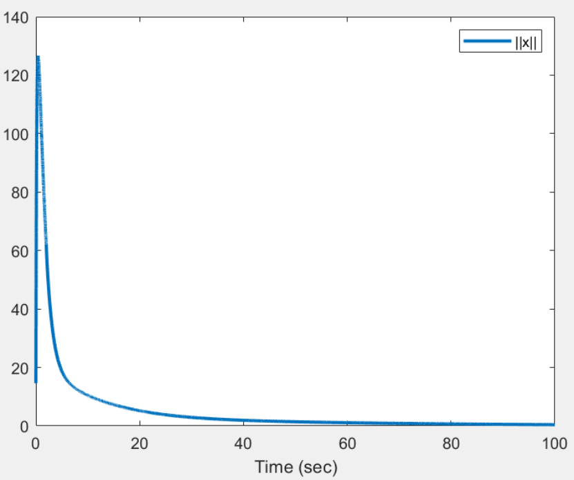 系统状态向量范数随时间变化的响应曲线收敛性良好,控制算法能快速抑制初始偏差(如发动机启动时的状态波动),动态响应能力强。