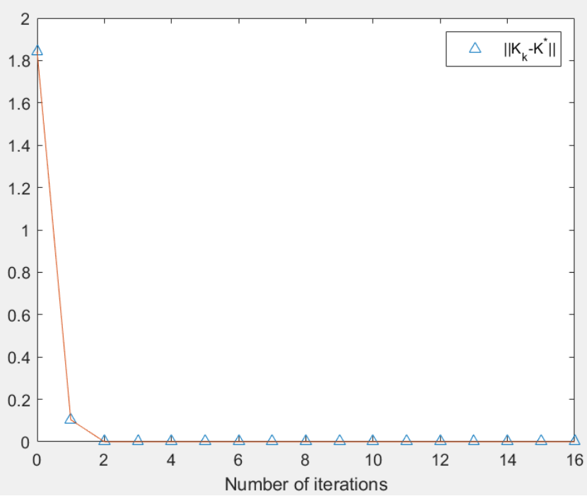 随着迭代次数增加,增益控制矩阵范数误差趋于0,满足最优控制条件。