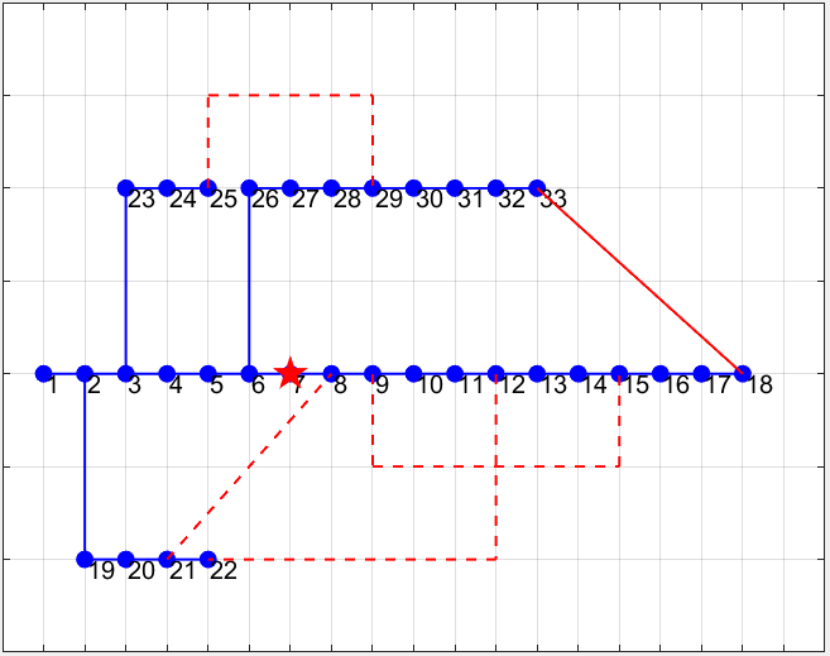 红色五角星代表故障节点,红色实线为常开联络线路闭合开关,红色虚线为常开联络线路。