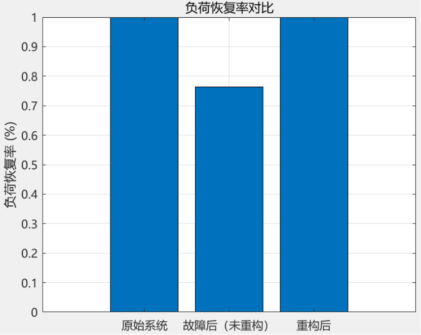 针对含分布式电源的配电网故障后快速恢复供电的需求,提出一种基于改进深度优先搜索(DFS)与二进制粒子群优化(PSO)的混合故障重构方法。首先,建立 IEEE33 节点系统数据模型,包括节点负荷、分布式电源(PV 节点)及支路参数(电阻、电抗、状态),通过归一化处理和邻接矩阵构建初始网络拓扑;其次,模拟故障场景后,采用改进 DFS 算法识别故障隔离后的孤岛分布,从主电源与分布式电源出发划分可供电孤岛;然后,以联络支路开关状态为优化变量,构建包含功率损耗、负荷恢复率、环网惩罚及孤岛节点数的多目标适应度函数,结合动态惯性权重与学习因子的二进制 PSO 算法优化重构方案;最后,通过拓扑遍历计算负荷恢复率,对比不同故障场景的恢复效果,并可视化原始拓扑、故障后拓扑、孤岛划分及重构结果。仿真结果表明,改进 DFS 能准确识别孤岛,二进制 PSO 算法可有效搜索最优开关组合,重构后负荷恢复率达 90% 以上,验证了方法在辐射状约束下提升供电可靠性的有效性。