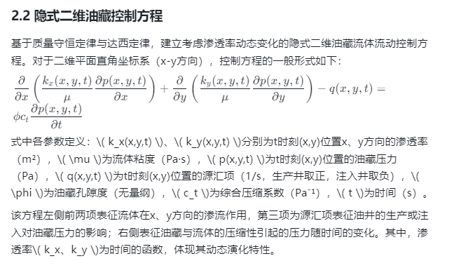 渗透率与压力是油藏流体流动的关键参数:渗透率决定流体在多孔介质中的流动能力,其空间分布不均及随开发过程的动态变化(如应力敏感导致的渗透率衰减、水驱冲刷引起的渗透率改变)直接影响流体流动路径;压力作为驱动流体流动的动力源,其随时间的演化规律直接反映油藏能量消耗与补充状态。因此,精准模拟隐式二维油藏中渗透率与压力的动态变化,对揭示油藏开发机理、提升开发效益具有重要意义。