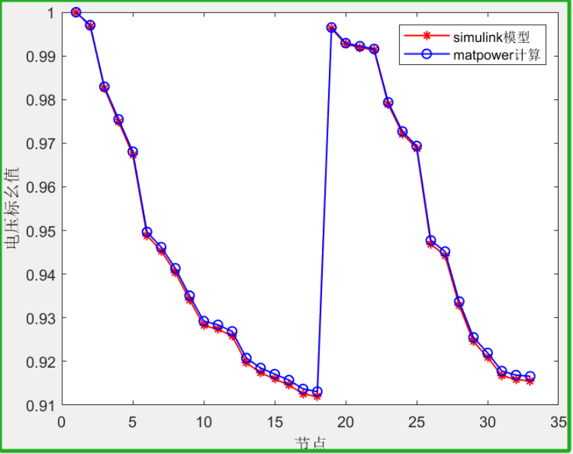 在学术研究范式中,通常需通过研究对象的对比分析,验证仿真模型的有效性及研究结论的可靠性。基于此,本程序在Simulink仿真的基础上,引入Matpower潮流计算结果作为验证基准,对系统进入稳态运行后的Simulink仿真结果与Matpower计算结果进行量化对比分析,最终验证了所构建仿真模型的准确性。