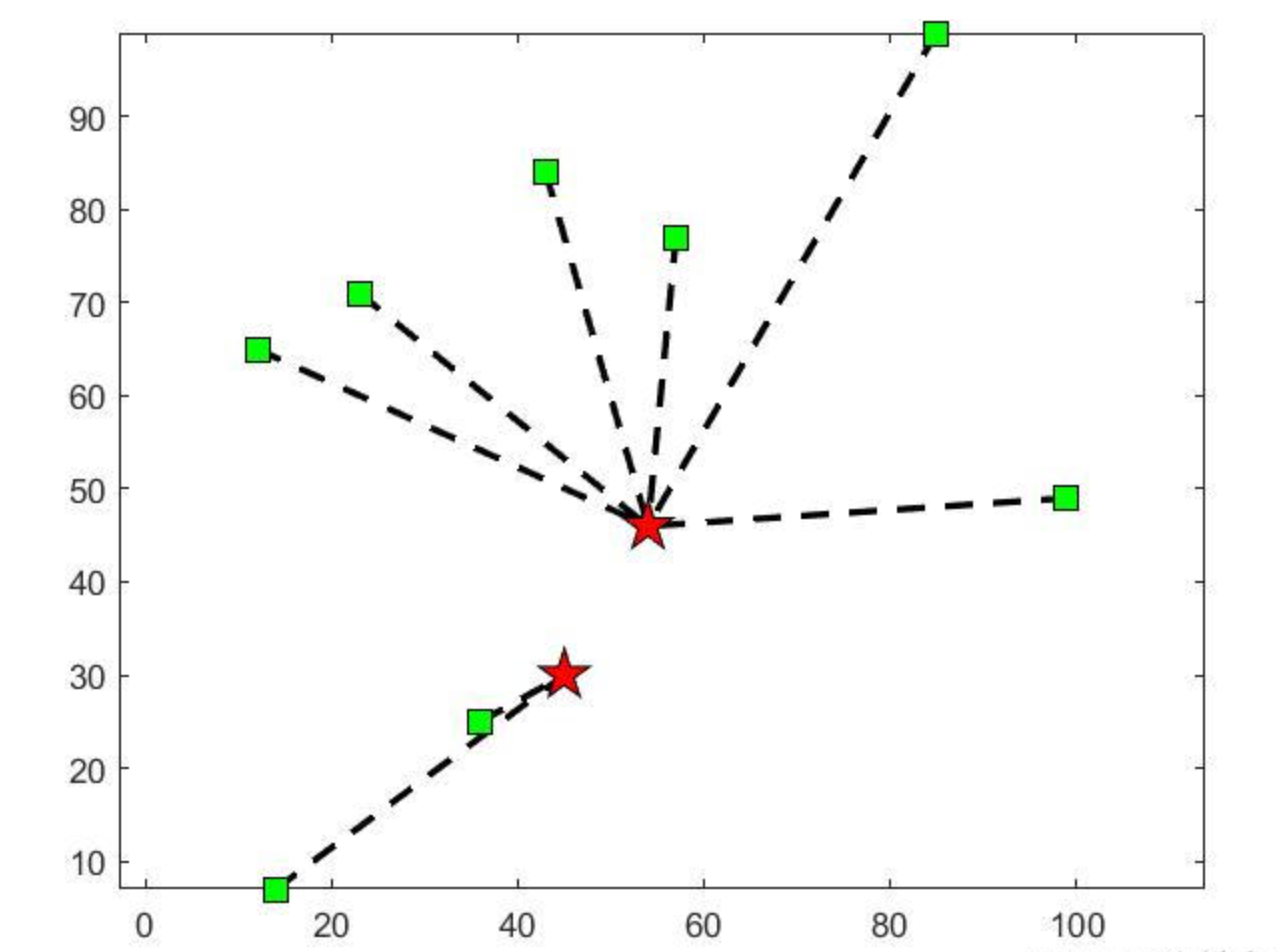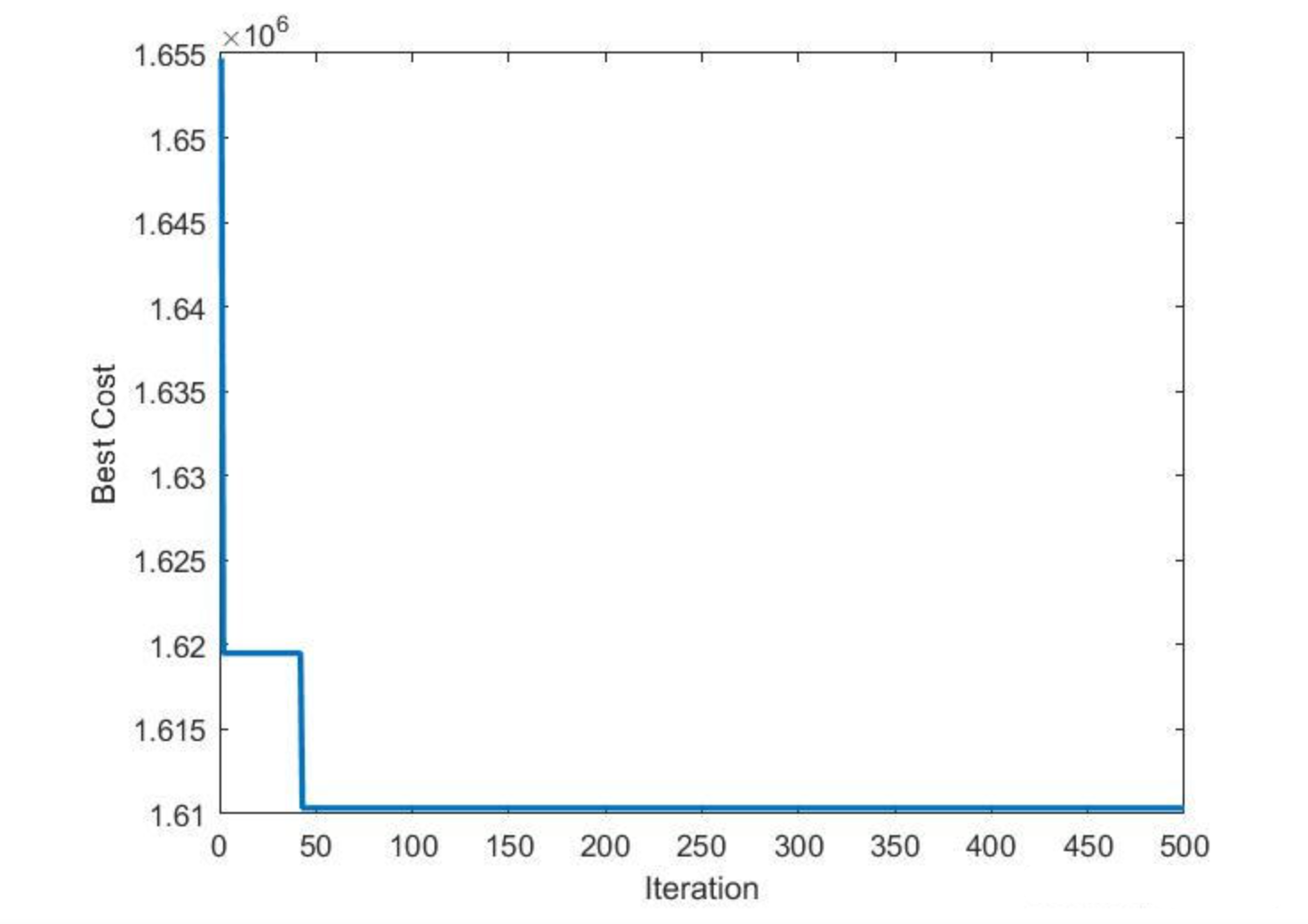 通过多轮迭代,粒子群不断向gbest逼近,最终gbest对应的选址方案即为近似最优解。