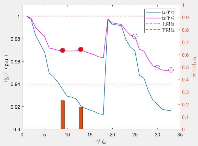 本程序主要复现《考虑泄流效应的风电场并网点电压系统侧增援调控方法_于其宜》一文的核心思路,通过光伏电源取代原文中的风电电源,重点研究特定时刻光伏并网场景下的电压增援调控方法。程序设计了两类调控决策方法:一是用于分配增援调控任务的启发式决策方法,二是考虑调控代价差异的线性规划模型优化决策方法。研究以IEEE33节点系统作为仿真对象,通过仿真验证了所提方法的可行性。