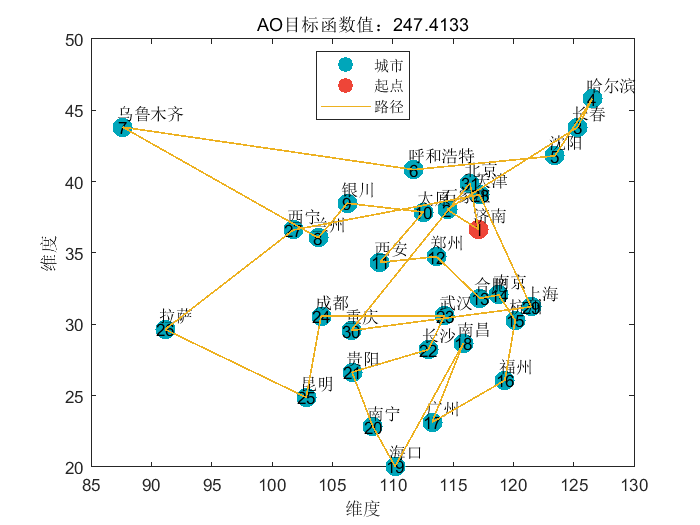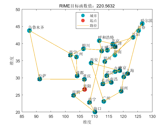 【TSP问题】基于雾凇算法RIME和天鹰算法AO求解旅行商TSP问题(可根据城市的经纬度设置自己想要到达的地区)附Matlab代码