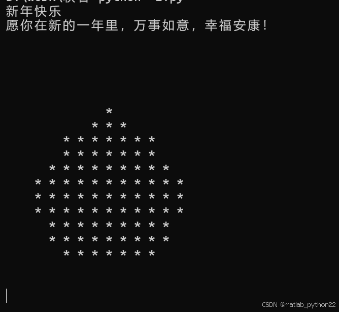 新年祝福语逐个字符打印出来,然后雪花图案逐渐出现5次。