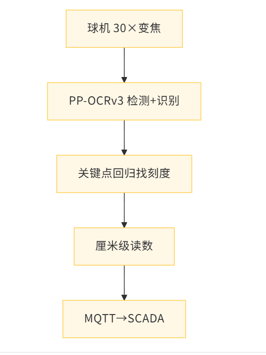 球机 30× 光学变焦抓图 → Jetson Xavier NX 上运行 PaddleOCR 检测数字区域 + 关键点回归定位刻度 → 每 10 min 把读数和置信度经 MQTT 写入 SCADA,供调度大屏实时展示。