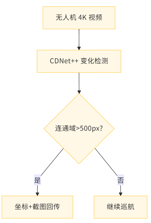 卫星图 + 无人机正射影像 → 云端 GPU 运行 CDNet++ 像素级变化检测 → 输出新增建筑矢量 → 与国土“一张图”叠加,生成周级违建图斑报告,一键推送执法。
