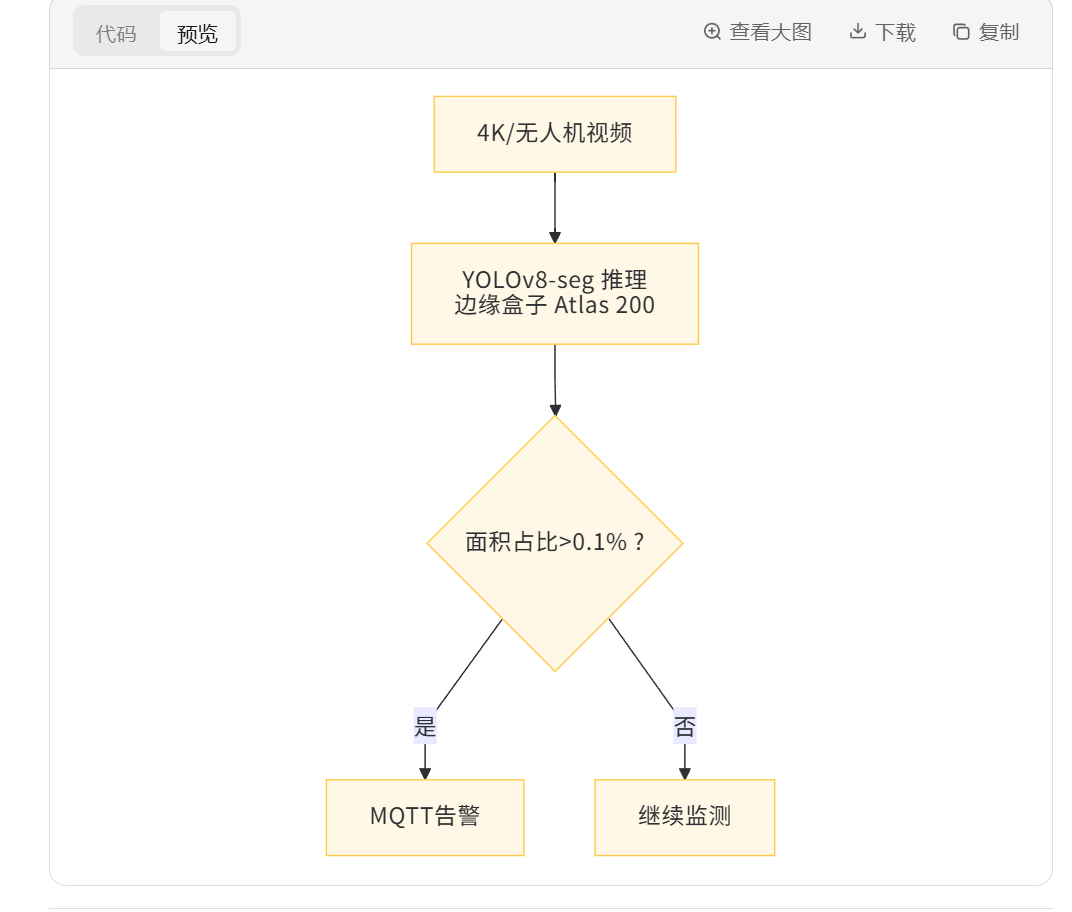 “枪机+无人机”双视角采集 → 边缘昇腾 200 DK 运行 YOLOv8-seg,将漂浮物像素级分割并输出类别与面积 → 通过 MQTT 秒级推送到河长 APP 工单系统,实现“发现-派单-处置”闭环。