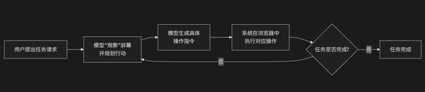 循环:模型根据“操作后”的新界面,再次进行感知、决策和行动,如此循环,直到你提出的任务完成为止。