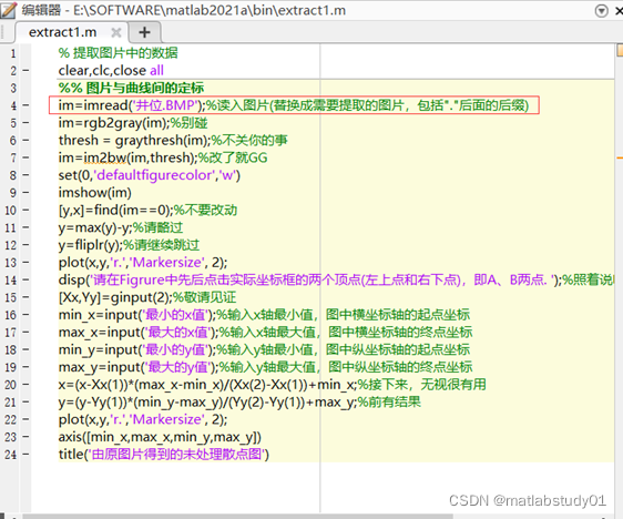 im=imread('井位.BMP');%读入图片(替换成需要提取的图片,包括"."后面的后缀)