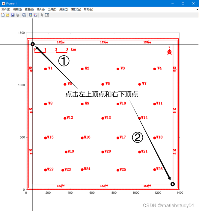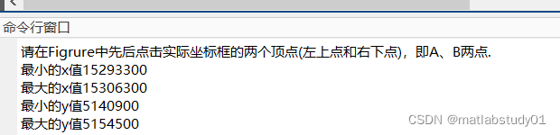 点击编辑器代码框上方“运行”按钮,开始运行代码,代码成功运行后会弹出名为“Figure1”的图像窗口,并在编辑器代码狂下方的命令行窗口中出现提示,接下来用鼠标按照顺序左键点击一下图像中的坐标框左上角顶点与右下角顶点(图2.3)。
