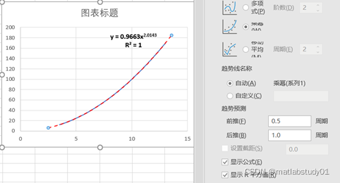在完成上述步骤后,打开Matlab主界面,在右侧的工作区会出现曲线提取的结果,第一个ans条目即为提取曲线的x坐标与y坐标集合。在本实例中,将数据复制粘贴到Excel,以左侧列数据为x,右侧列数据为y,然后插入“带平滑线的散点图”(如图2.10),接着再图表中插入“乘幂趋势线”,勾选“显示公式”和“显示R平方值”(如图2.11)。
