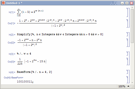 0·2^(w(n-1)) + 1·2^(w(n-2)) + 2·2^(w(n-3)) + ... + (n-1)·2^0