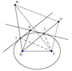 椭圆有一个神奇的性质:从一个焦点射出的光线,经过椭圆曲线的反射后,总会到达另一个焦点。换句话说,两个焦点分别与切点相连,这两条连线与切线夹角相等。再换句话说,将F沿切线AS反射,对称点M恰好落在EA的延长线上;同样地,令N为F关于BS的对称点,则N、B、E三点共线。又由椭圆的定义,EA+FA=EB+FB。于是,我们有: