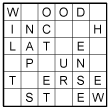 下面的例子演示了有12个单词的情况,其中横向的单词为WOOD, INCH, LATE, PUN, TERSE, STEW,纵向的单词为WILT, NAPS, OCTET, OUR, DENSE, HEW。