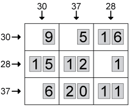 14张写有数字的卡片放在了3x3的格子里,每行每列的数字之和已经给出。拿起其中两张卡片,放回格子中的任意位置,使得六个总和相等。