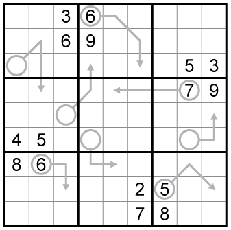 数独加强版:每个圆圈里的数必须要等于对应箭头标识的路径上的数之和。