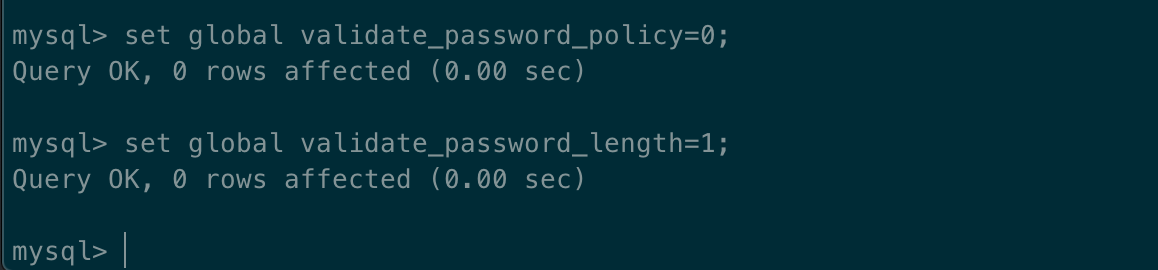 set global validate_password_policy=0; //基于长度判断密码标准 set global validate_password_length=1; //设置长度最低为4