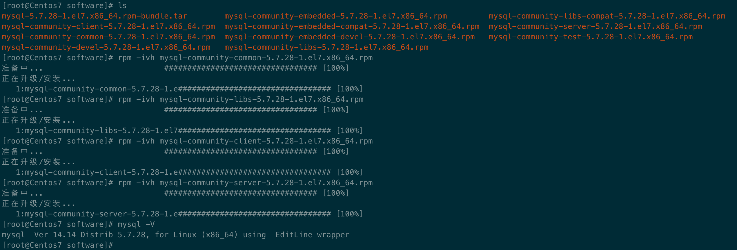 rpm -ivh mysql-community-common-5.7.28-1.el7.x86_64.rpm rpm -ivh mysql-community-libs-5.7.28-1.el7.x86_64.rpm rpm -ivh mysql-community-client-5.7.28-1.el7.x86_64.rpm rpm -ivh mysql-community-server-5.7.28-1.el7.x86_64.rpm