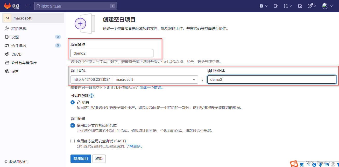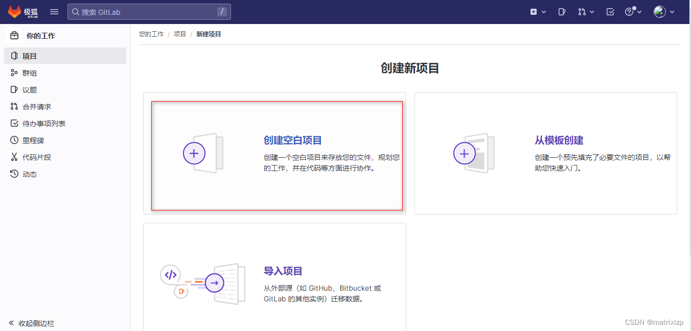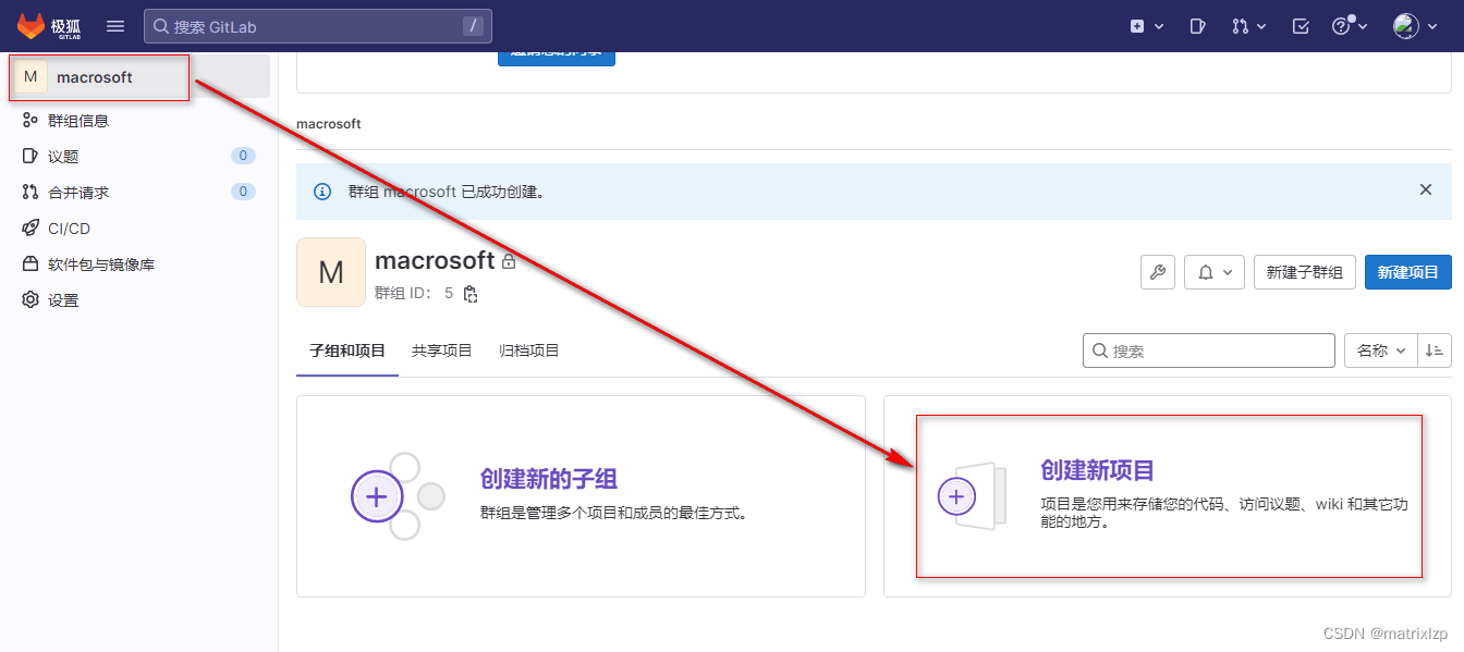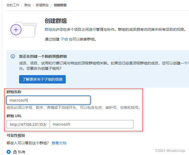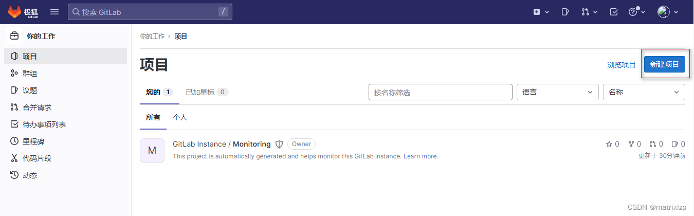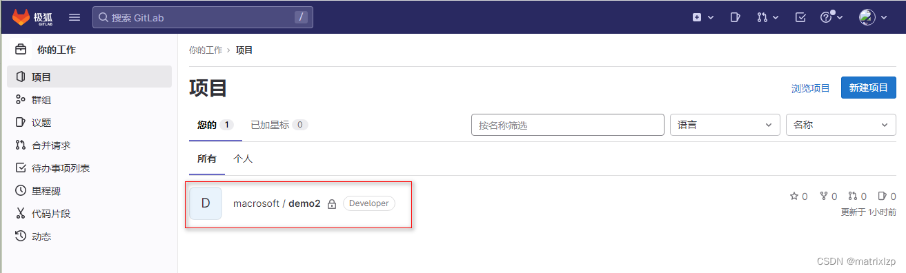 我们之前创建的项目,URL中间的那一串就是群组,不过是 gitlab 默认给我们创建的。是没有意义的。现在我们自己新建一个以公司名命名的群组。