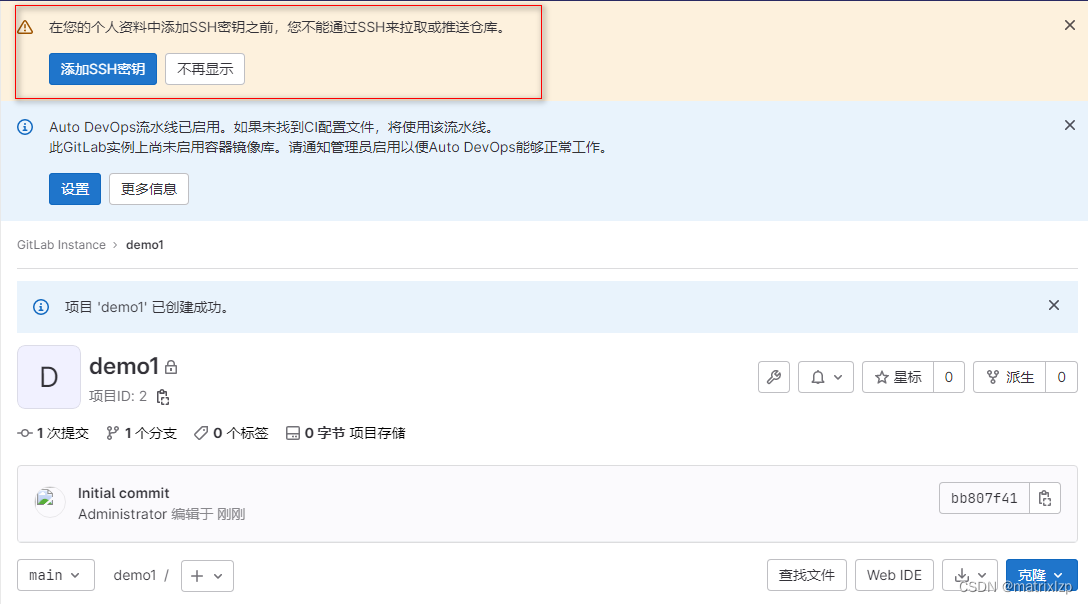 新建完会提示我们【添加SSH秘钥】,可以忽略,因为我们不是用SSH客户端来提交代码。