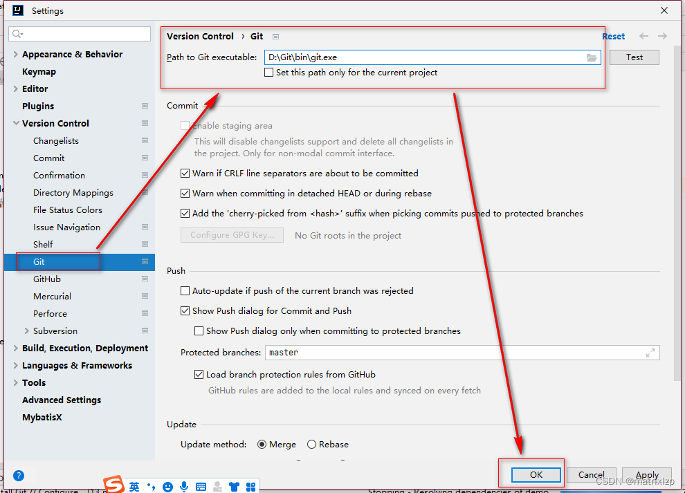 打开 IDEA Settings-Git-在 Path to Git executable 里面选择本机安装的Git目录