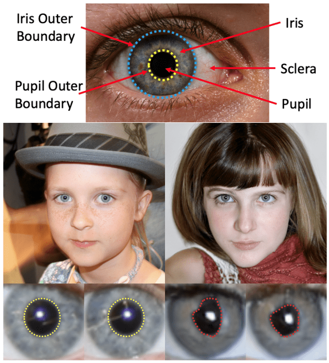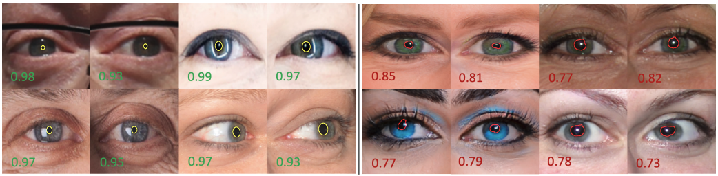 这个方法很简单。为了检测瞳孔形状的假象,如下图所示,并确定GAN生成的人脸,该方法首先自动提取两只眼睛的瞳孔面具,并评估它们是否是椭圆形的。