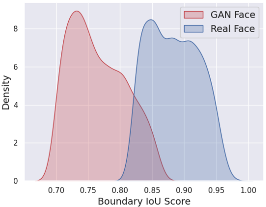 在预测的瞳孔遮盖物和椭圆拟合的瞳孔遮盖物之间,它是比较高的。然而,不规则形状的瞳孔伪影会大大降低BIoU的得分。真实面孔和GAN生成的面孔的学生的BIoU分数的分布也显示在下图中。两种分布之间有明显的区别,表明不规则的瞳孔形状是区分真实和GAN生成的脸的有效手段。