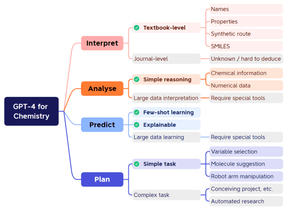 近年来,人工智能的发展主要集中在 GPT-4 等大型语言模型上。2023 年 3 月发布的这一先进模型展示了利用广泛知识应对从化学研究到日常问题解决等复杂挑战的能力。也开始进行研究,对化学的各个领域,从化学键到有机化学和物理化学,都有深入的见解。该模型可以根据现有知识预测潜在的新化合物和新反应,还可以通过网络搜索和编程语言链接到外部环境并扩展其功能。