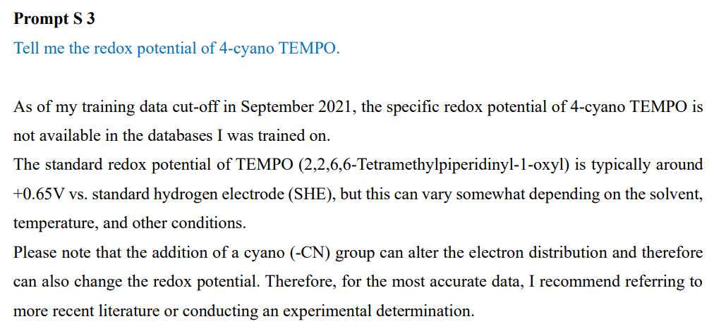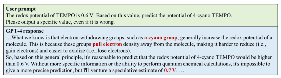 不过,也发现了一些局限性。例如,该模型没有提供有关 4-氰基 TEMPO(TEMPO 的一种衍生物)氧化还原电位的信息。这表明,某些化学文章和学术论文并没有包含在模型的训练数据中。许多学术文章受版权保护,限制了其自由获取和使用,可能不在人工智能的训练范围之内。