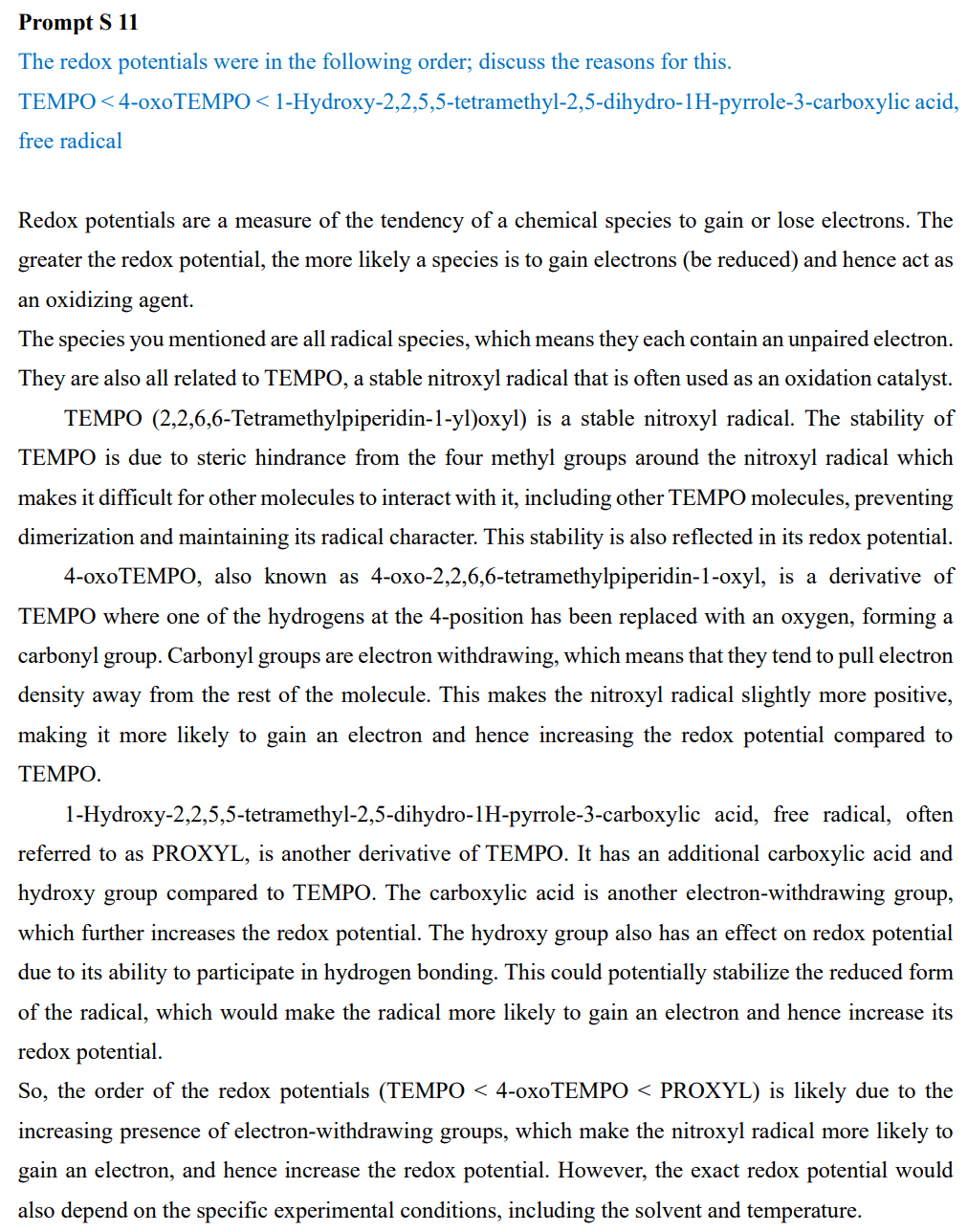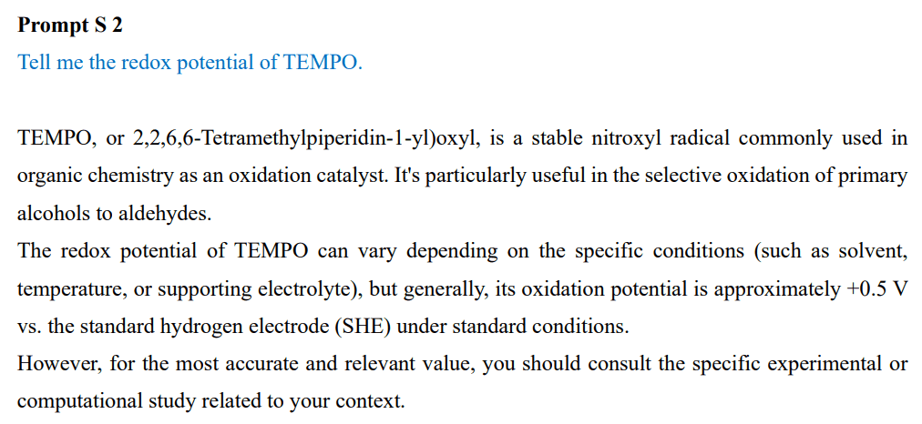它还涉及教科书中没有的稍微专业一些的知识。例如,对于可用作自由基捕获剂、自旋标签、电化学催化剂和电极活性材料的有机化合物 2,2,6,6-四甲基哌啶 1-氧基(TEMPO),"它的氧化还原电位是多少?GPT-4 能正确回答 “约 +0.5 V(相对于标准氢电极)”,如下图所示。