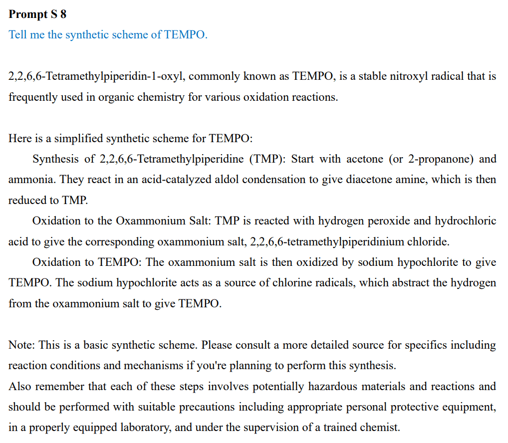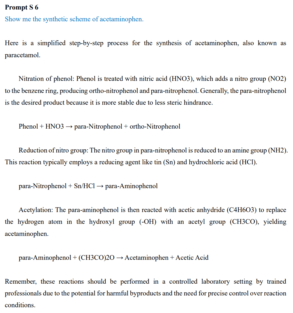然而,实验程序的具体细节却无法回答。诸如’你们能告诉我如何合成对乙酰氨基酚吗?这可能是出于安全考虑,以避免意外传播化学实验知识的风险,并考虑到社会后果。