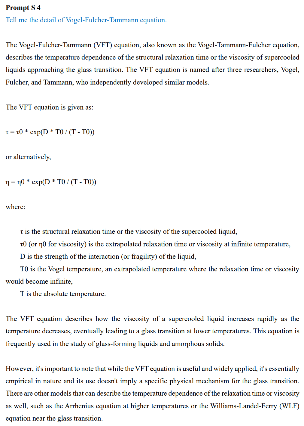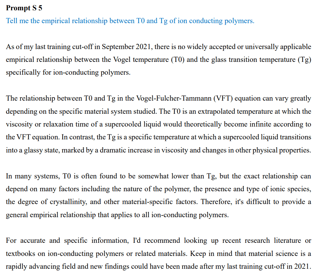 然而,GPT-4 也有其局限性。特别是,它不具备学术论文级别的专业知识,如 20 世纪 80 年代报道的经验法则(𝑇g = 𝑇0 + 50),该法则显示了聚合物中 Vogel 温度 𝑇0 与玻璃化转变温度 𝑇g 之间的关系。这表明 GPT-4 是基于截至 2021 年 9 月的知识,由于学术论文的版权问题,并不涵盖最新的研究。