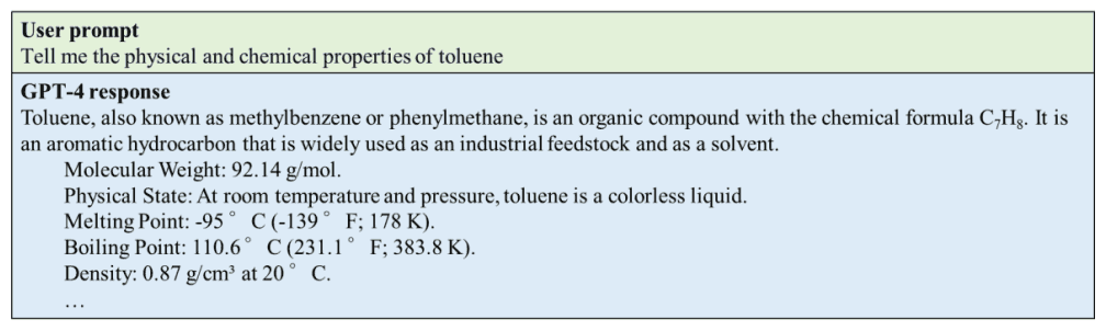 第一步是了解 GPT-4 对化合物的了解程度。了解 GPT-4 对这些基本知识的理解程度非常重要。GPT-4 在这方面表现突出。例如,它能够准确理解和描述甲苯(化学式 C7H8)这种广泛使用的工业原料的物理和化学性质–分子量、熔点、沸点、芳香性、化学稳定性和反应性,如下图所示。这些知识可能是 GPT-4 通过学习普通化学教科书和网站获得的。