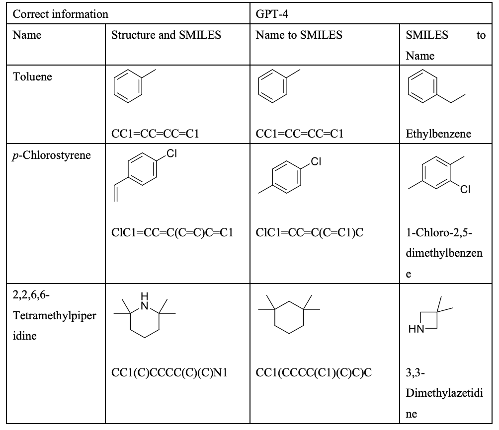 论文显示,GPT-4 在化学研究的广泛任务中展示了各种能力,从有机化学到实验的自动机械臂控制。特别是,GPT-4 显示出对一般有机化学知识的深刻理解,但在专业内容(如特定合成方法)方面仍面临一些挑战。结果还显示,将化合物名称转换为 SMILES 符号是化学信息学领域常用的方法,在某些任务中表现良好,但训练数据的缺乏可能限制了其性能。