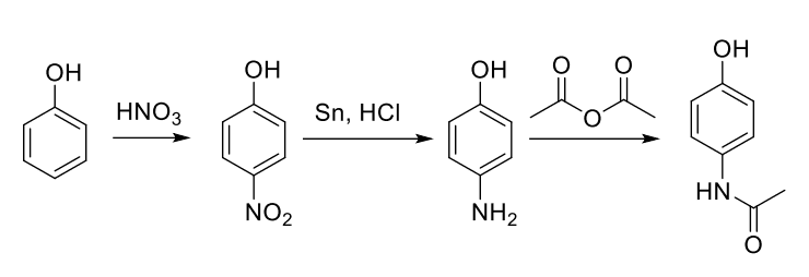 还考察了有机化学,GPT-4 展示了对这一领域基本课本知识的掌握。例如,下图显示GPT-4了解对乙酰氨基酚合成途径的描述–该过程从苯酚开始,经过硝化、锡还原和乙酸酐酰胺化反应得到所需的化合物。
