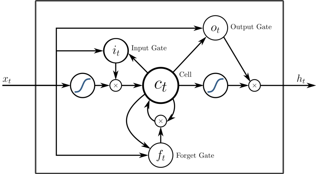 LSTM 模型由 三个不同的组件或门. 有一个 输入门、输出门和遗忘门。 与 RNN 非常相似,LSTM 在修改模型的内存和输入权重时会考虑前一个时间步的输入。 输入门决定哪些值是重要的并且应该让其通过模型。 输入门中使用了 sigmoid 函数,它决定哪些值要通过循环网络传递。 零会删除该值,而 1 会保留该值。 这里还使用了 TanH 函数,它决定输入值对模型的重要性,范围从 -1 到 1。